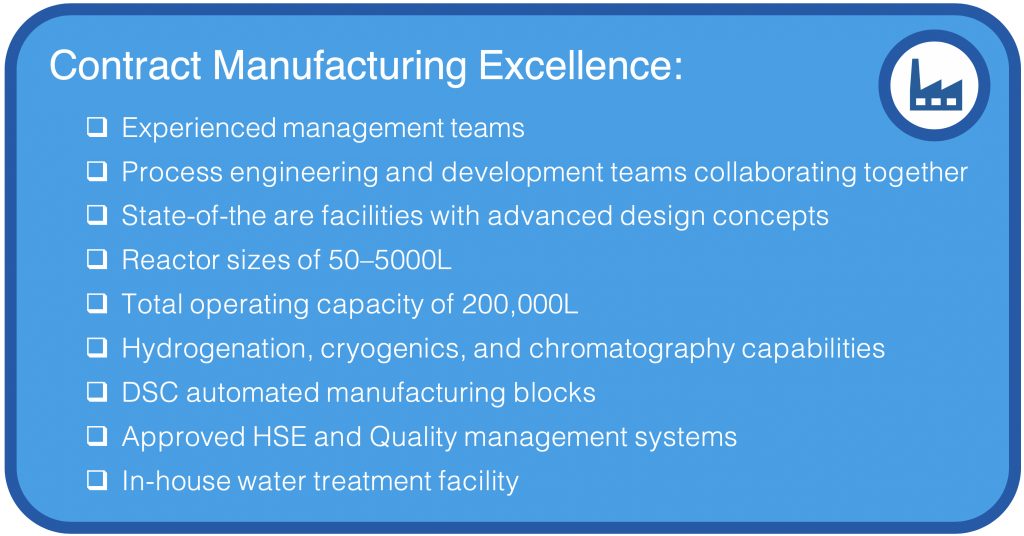 Developmental risk analysis is conducted on each process step before large-scale manufacturing is undertaken, to minimise HSE risks. Analytical chemical development is used to control quality, purity, and impurities.